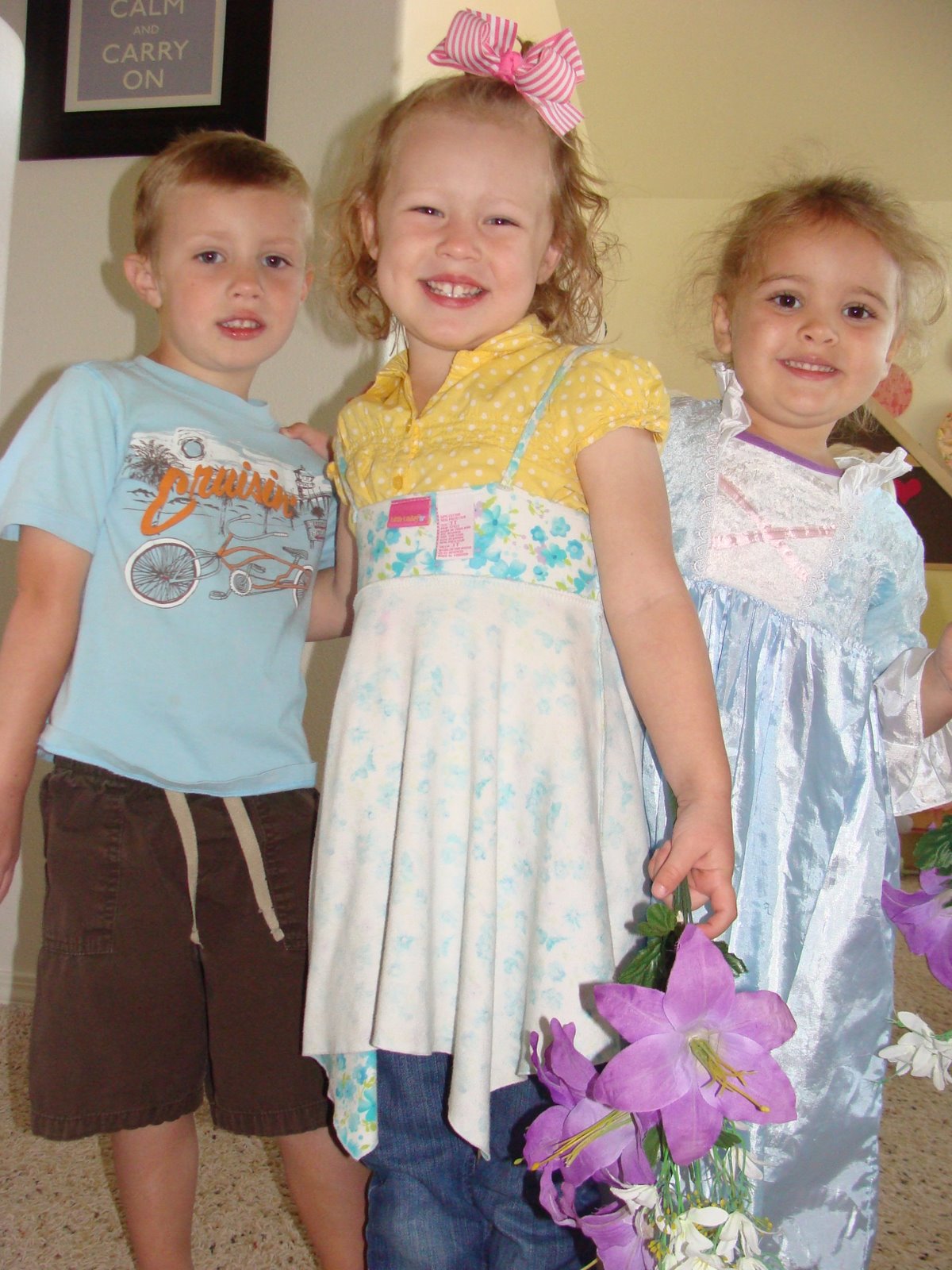 | We had joy school at our house a few weeks ago. Here she is posing her her "dress ups" with her cute little friends. |